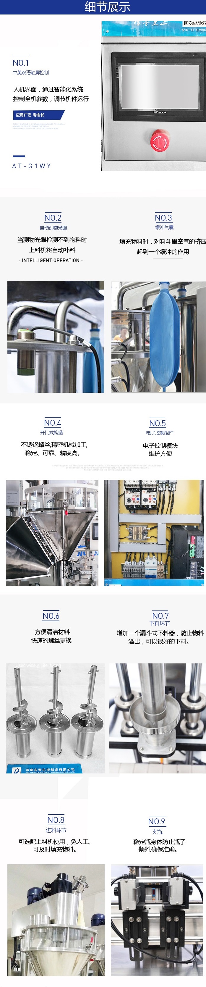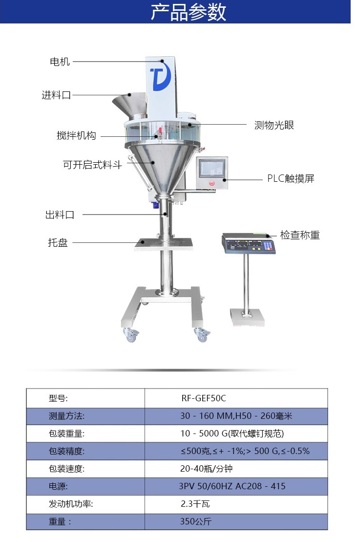 电源: AC380V 功率:900W 包装精度:±1% 包装规格:5g-5000g 包装速度:1500-3000袋/小时 总重量:380kg 整机尺寸:1000×650×2000(mm)