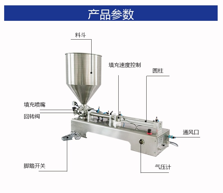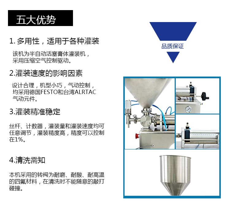 半自动膏体灌装机为全气动控制机型,在对洗面奶、油墨、软膏、乳膏、染发膏等膏体进行灌装时,全部采用压缩空气作为控制,并采用硬定位,有灌装量调节手柄、灌装 速度可任意调节,灌装闷头采用防滴漏、防拉丝及升降灌装装置。 本系列灌装机分为单头、双头和防爆式等机型,灌装精确度高,机型小巧,操作简便。